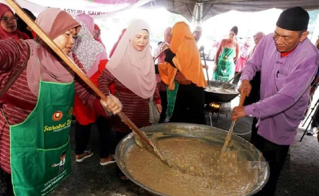 ABDUL Rahman Abdullah atau Chee Yin Wei, 38, (kanan) bersama mualaf lain mengacau bubur asyura pada Program Kacau Bubur Asyura Bersama Saudara Baru anjuran Lembaga Zakat Negeri Kedah (LZNK) baru-baru ini.